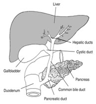 Endoscopic Retrograde Cholangio-pancreatography (ERCP) is a technique that combines the use of endoscopy and fluoroscopy(X-ray) to diagnose and treat certain problems of the biliary or pancreatic ductal systems. Through the special side-viewing endoscope, the physician can see the inside of the food pipe, stomach and duodenum. The bile duct and pancreatic duct open together into the duodenum (see figure below). The doctor can inject dye into the ducts to visualize them on X-ray. Also, through the working channel in the endoscope one can gain access into the desired duct by using special hydrophilic guide wires. The wire is then used to guide various instruments to perform procedures like bile duct stone removal and stent placement.
